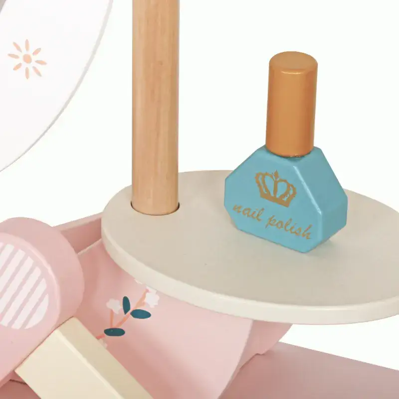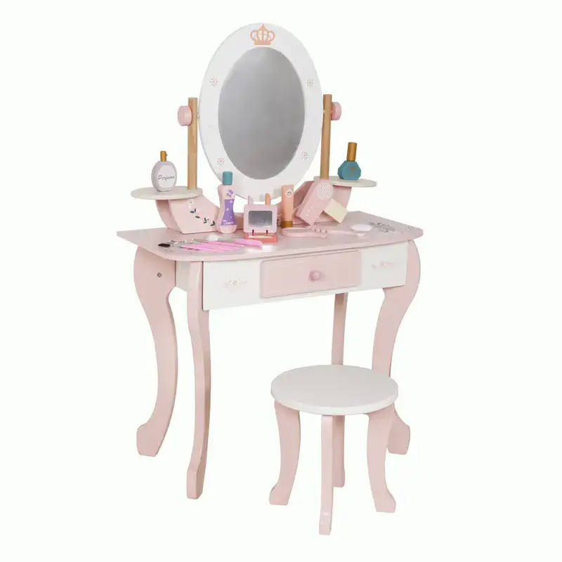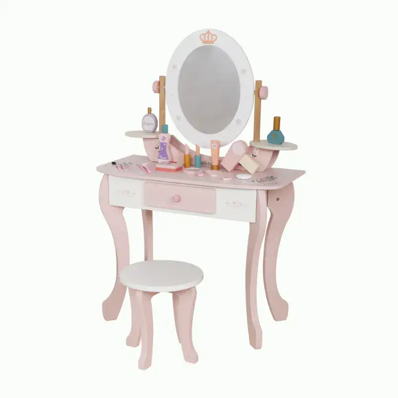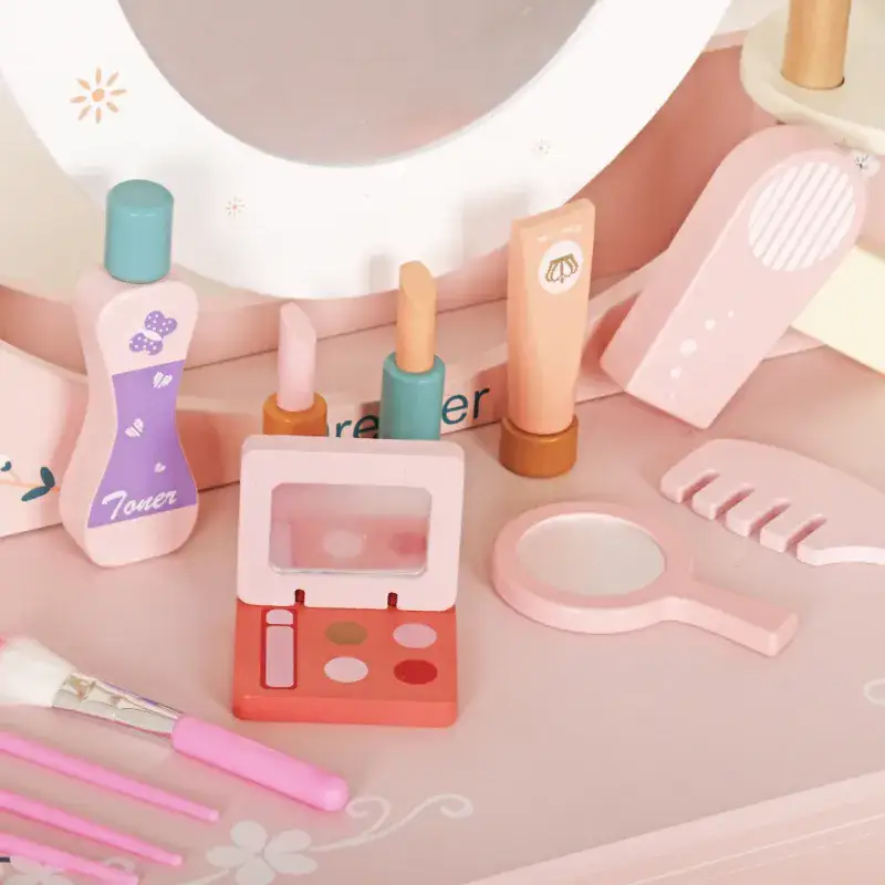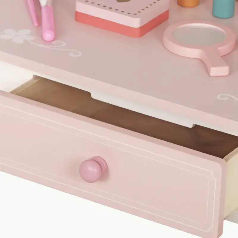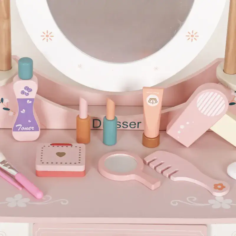 כולל מגירת אחסון וחמש אביזרי איפור מעץ לילדים